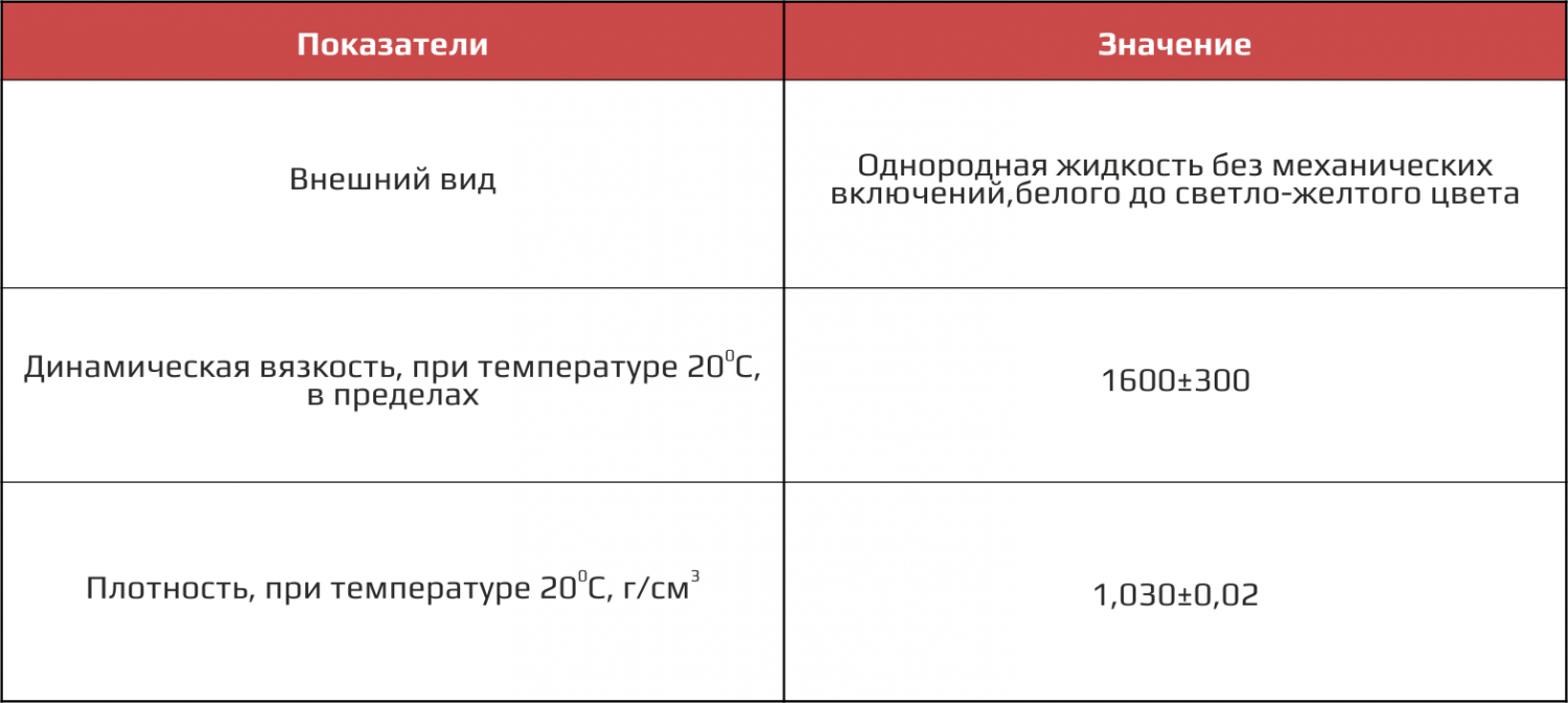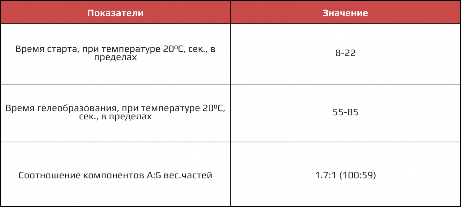 Приведенные значения получены в лабораторных условиях: перемешивание на мешалке в течение 5 сек. при температуре компонентов 20С., с числом оборотов мешалки 2700 в минуту и диаметром диска 40 мм.