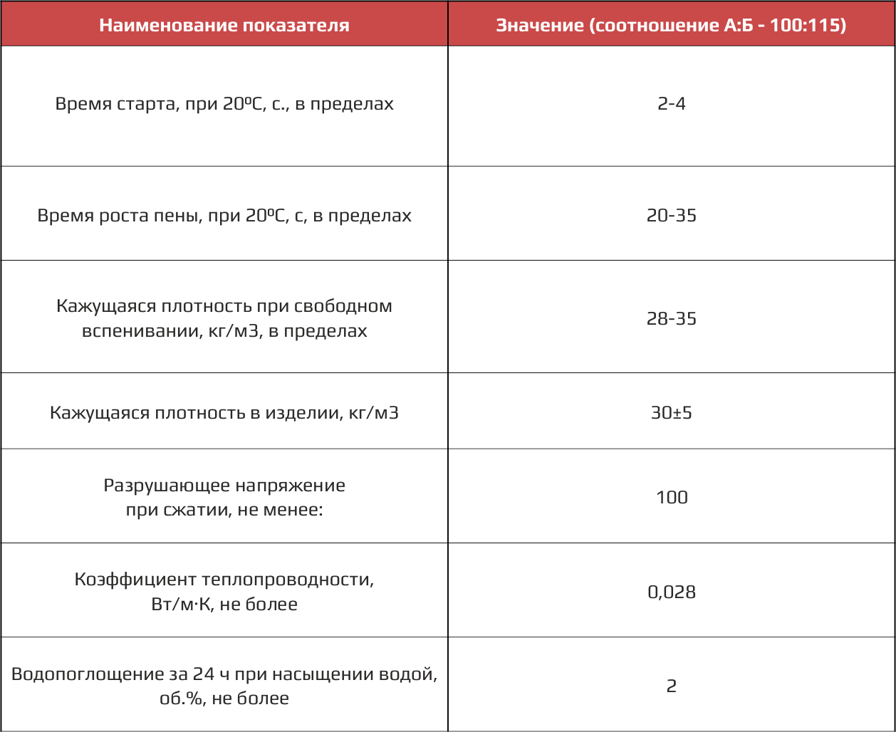 Образующийся пенополиуретан имеет превосходную адгезию к большинству строительных материалов, обладает невысокой плотностью в изделии (при соблюдении рекомендуемых условий напыления), высокими прочностными характеристиками, низким коэффициентом теплопроводности, экологически безопасен, равномерно наносится на напыляемую поверхность, образуя ровный глянцевый слой покрытия.